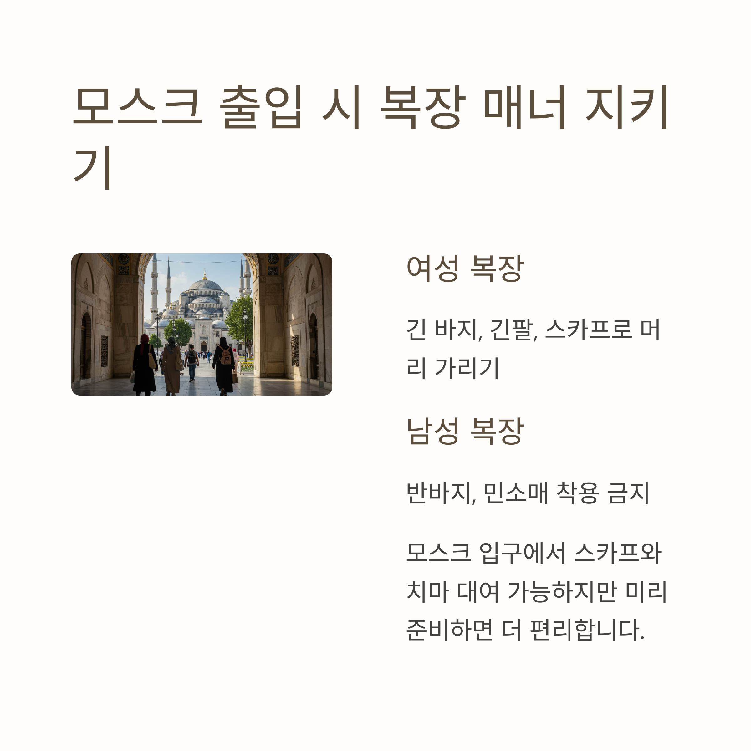 | 여성 | 긴 바지, 긴팔, 스카프 준비 (머리 가리기) |