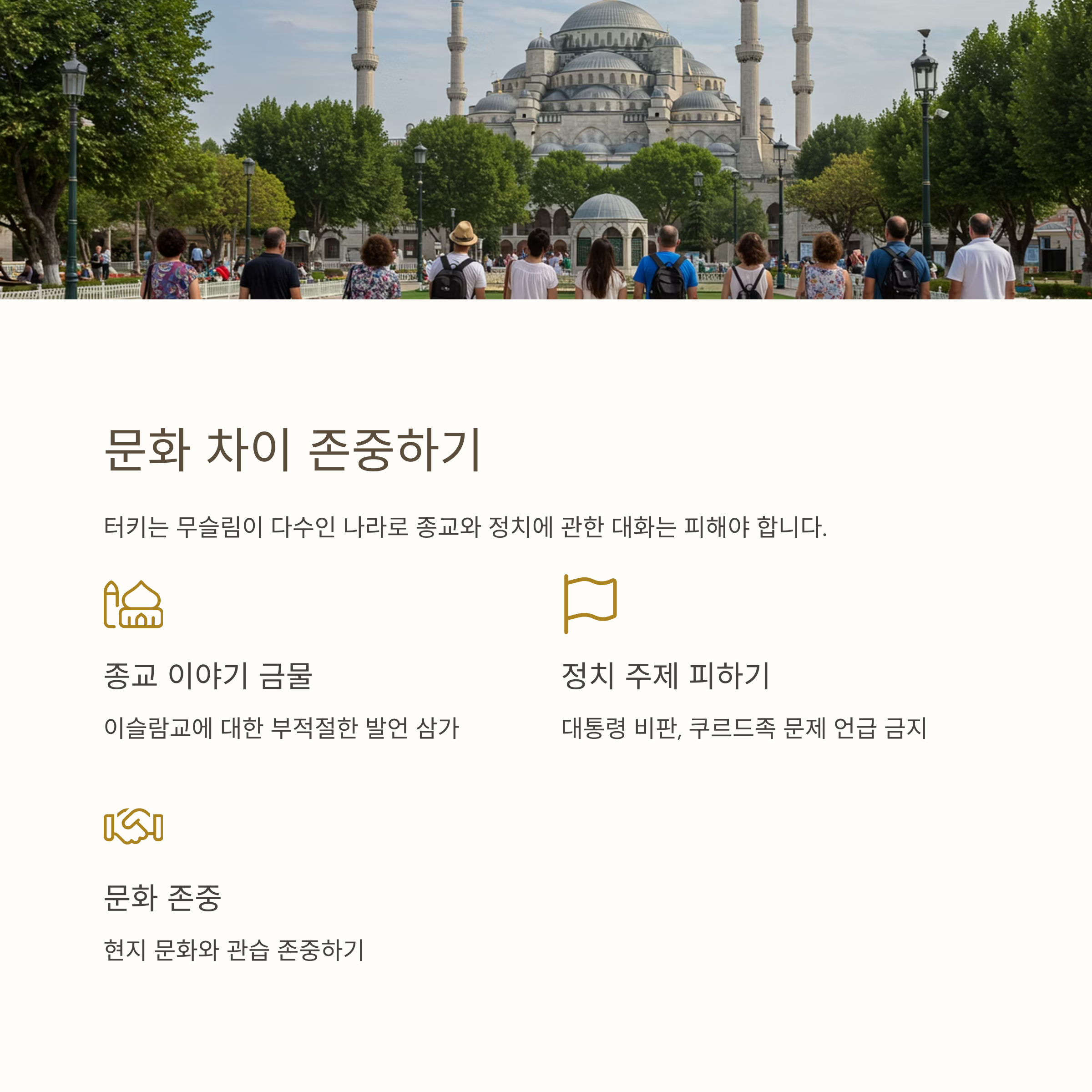 - 이슬람교, 정치, 종교적 이슈에 대해 함부로 발언하면 큰 실례가 됩니다.