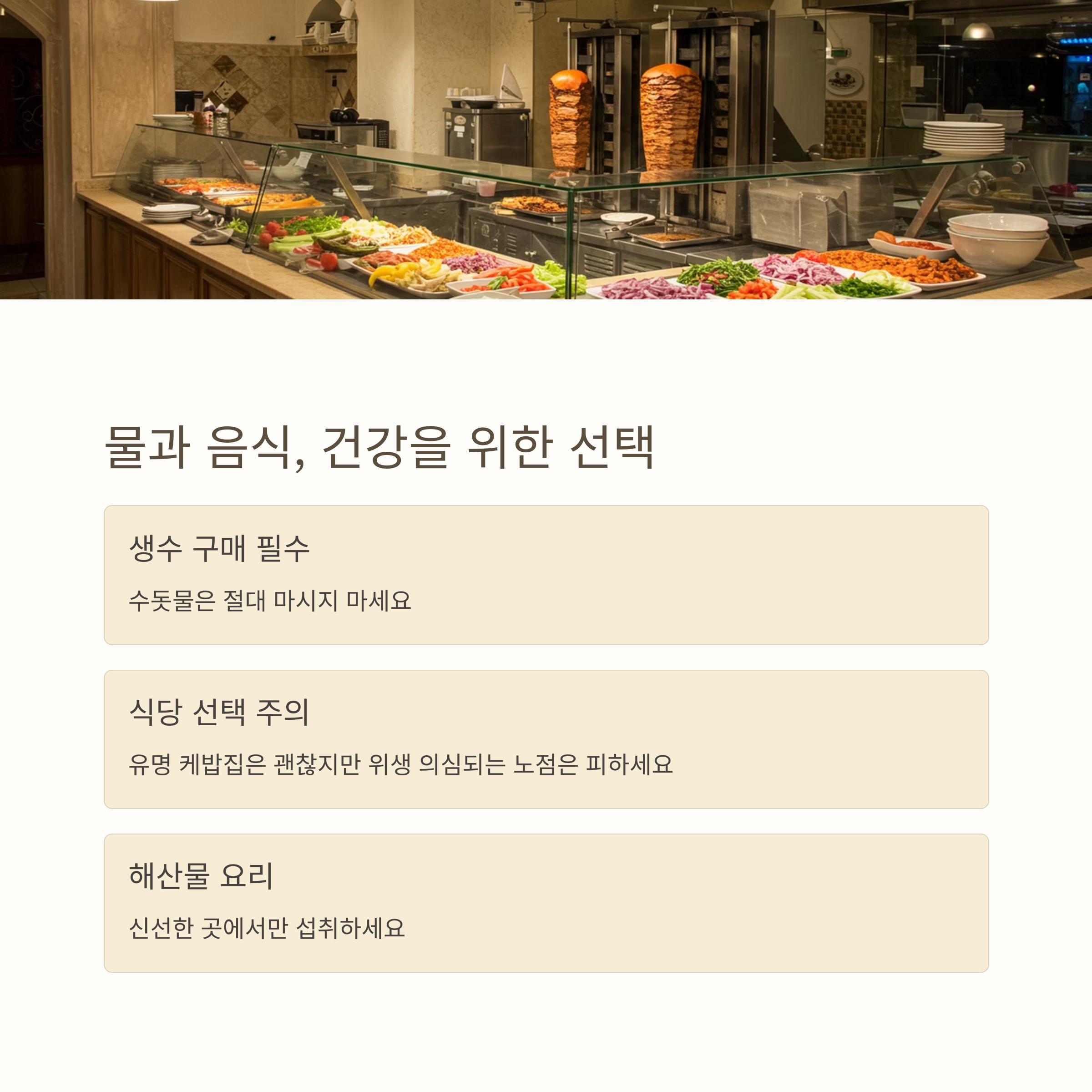 - 유명한 케밥집이나 식당은 괜찮지만, 위생이 의심되는 노점은 피하세요.
