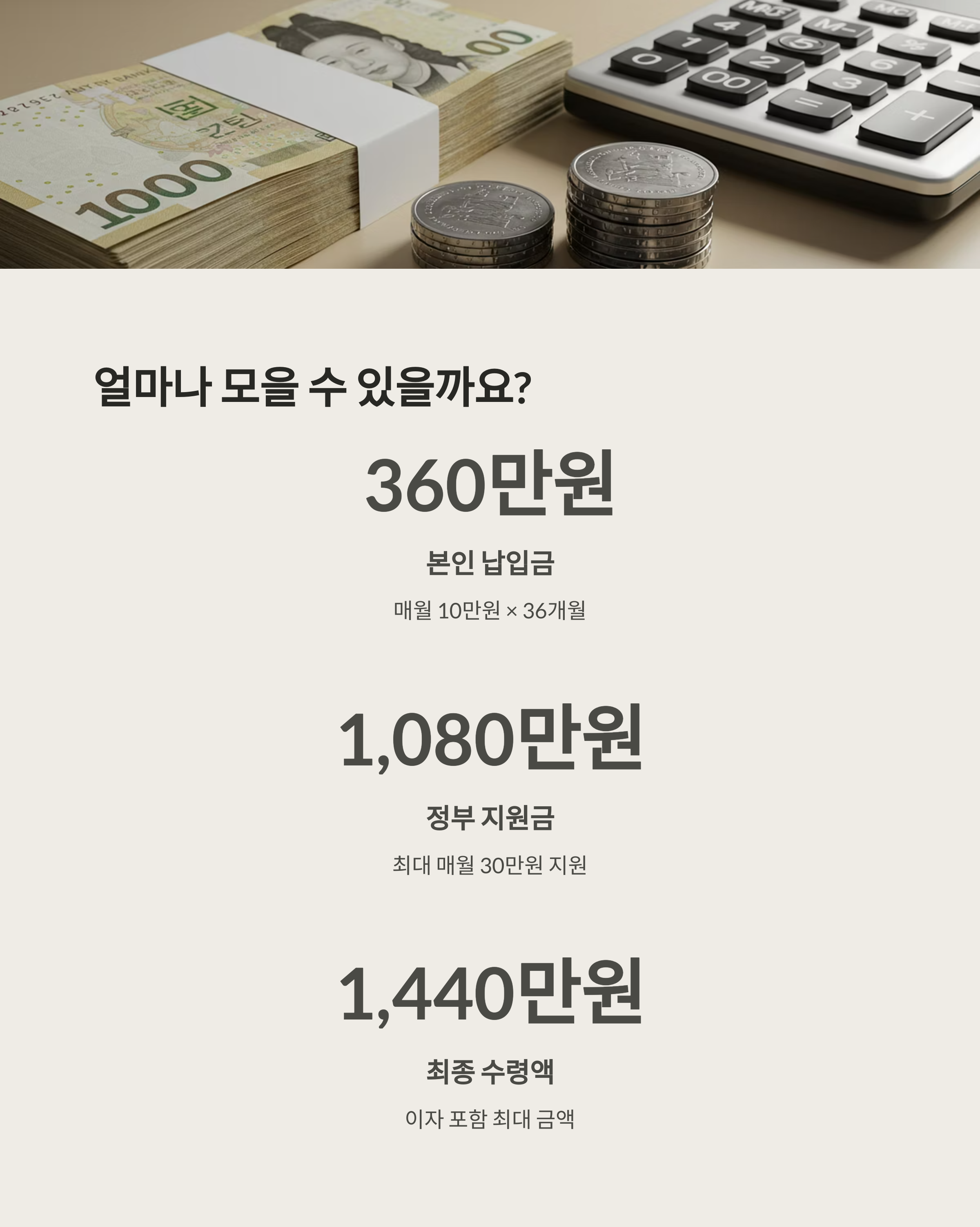 즉, 본인이 총 360만 원을 저축하면, 정부 지원으로 최대 1,440만 원의 목돈이 됩니다.