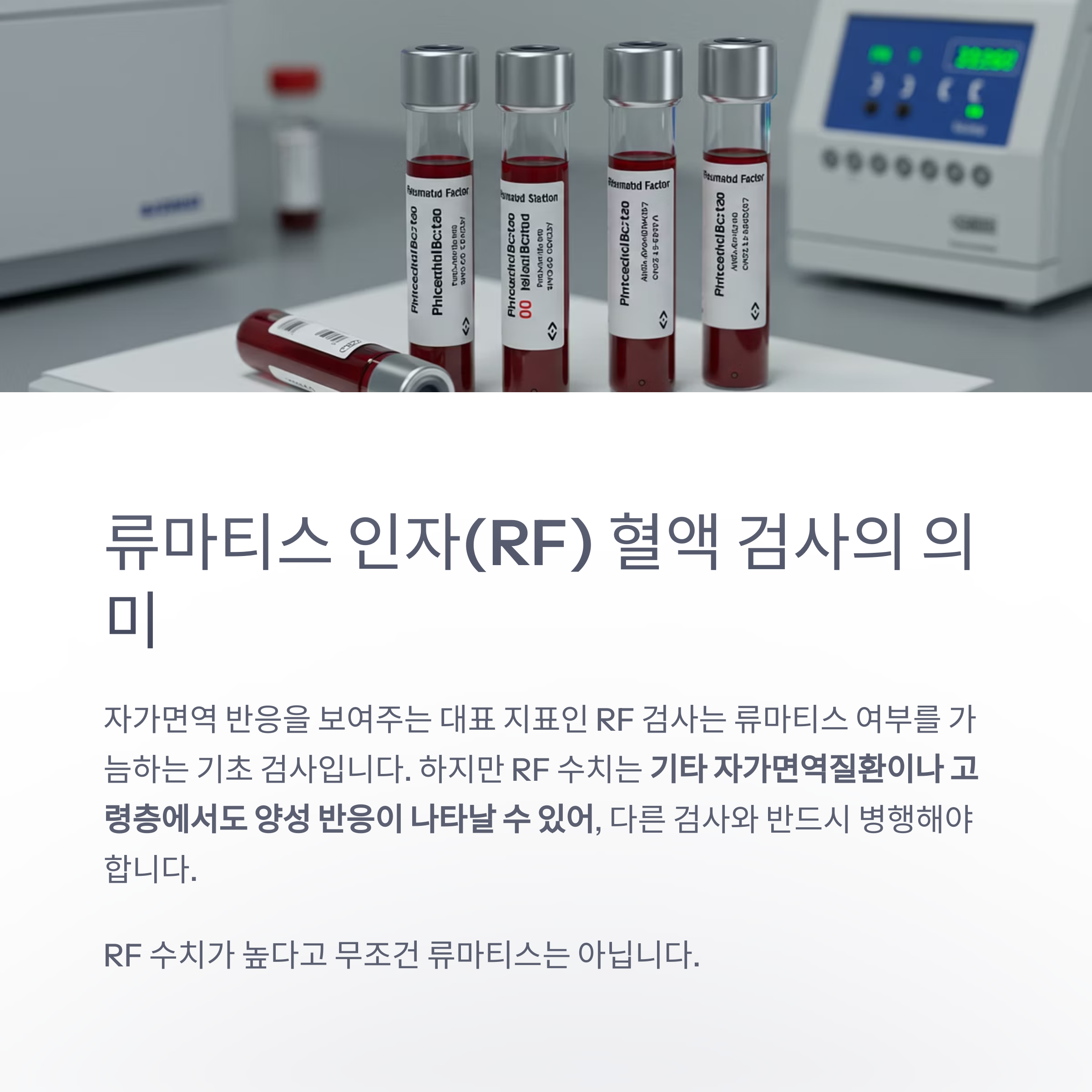자가면역 반응을 보여주는 대표 지표인 RF 검사는 류마티스 여부를 가늠하는 기초 검사입니다.