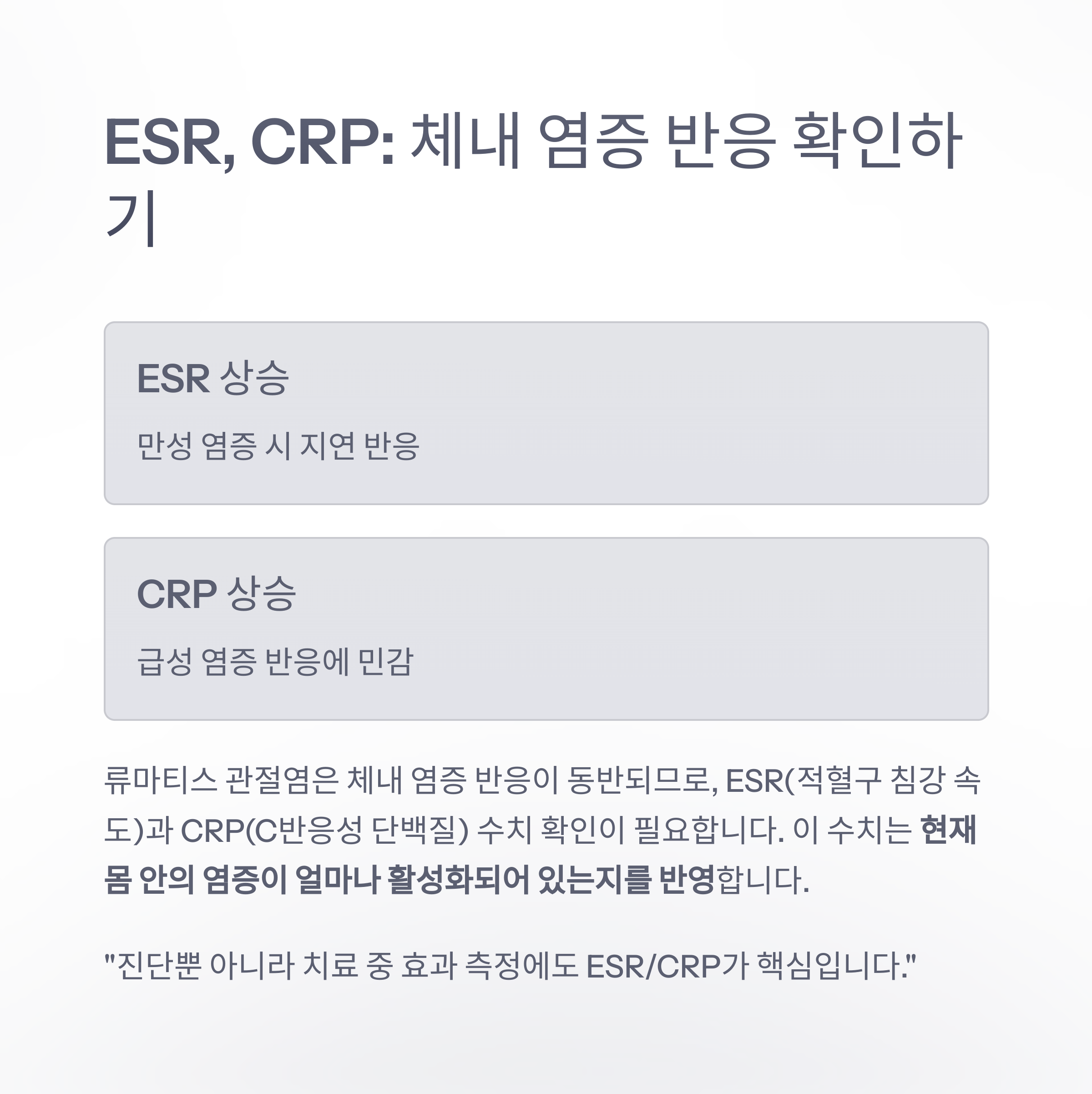"진단뿐 아니라 치료 중 효과 측정에도 ESR/CRP가 핵심입니다."