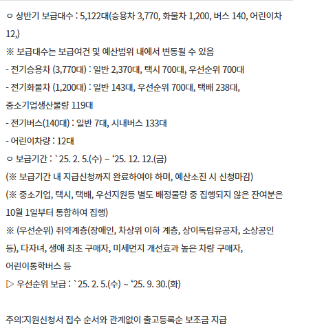 - 택시, 택배, 중소기업 전기화물차, 우선순위 보급: 2025년 9월 30일까지 별도 마감