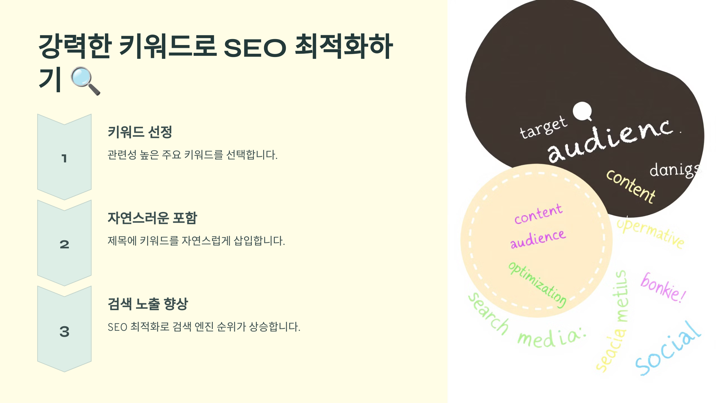 - 제목에 주요 키워드를 자연스럽게 포함하면 검색 엔진에서 노출 확률이 높아집니다.