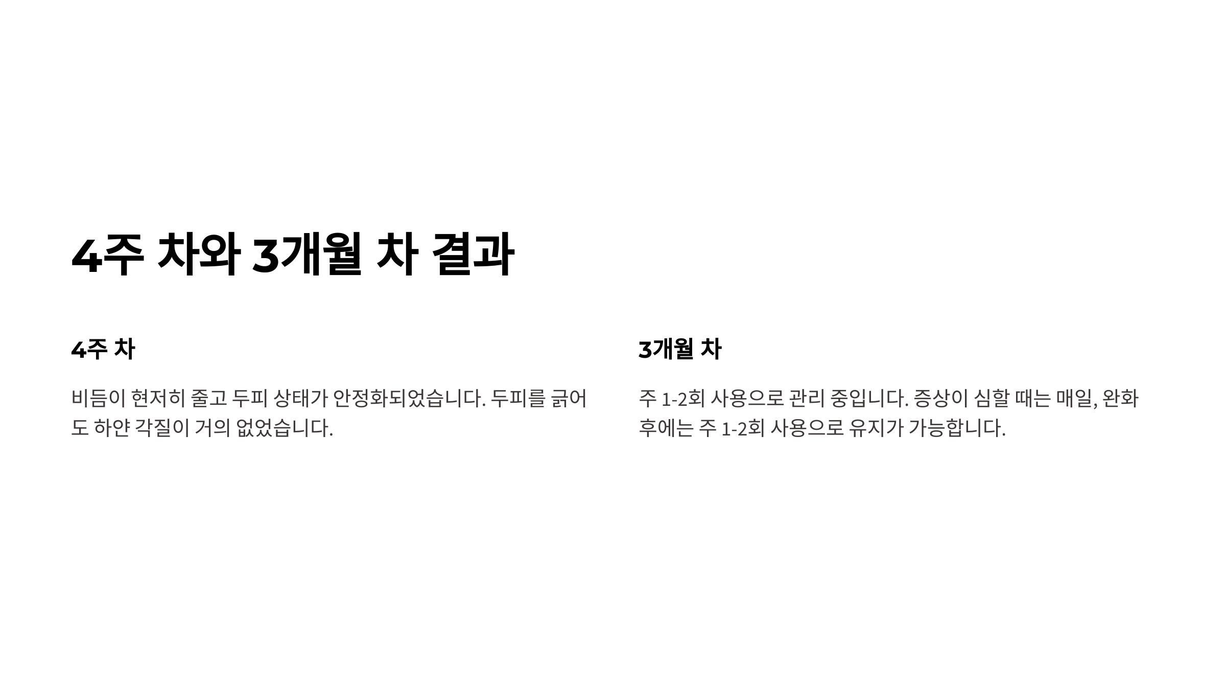 3개월 정도 꾸준히 써보니 비듬 걱정 없이 검은 옷을 입을 수 있을 정도로 효과가 좋았습니다.