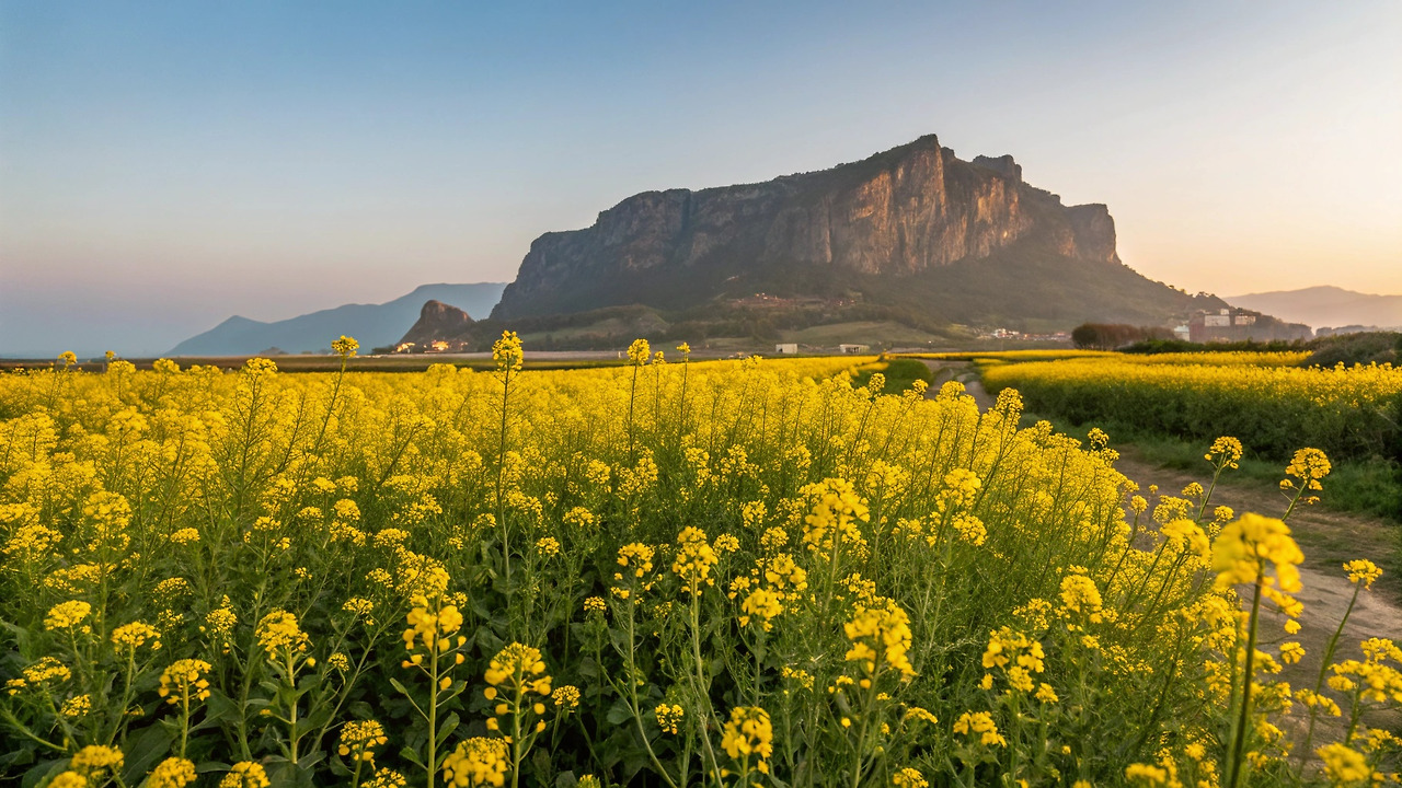 유채꽃 사이를 거닐면서 푸른 하늘과 노란 꽃밭이 어우러지는 장관을 감상해보세요!