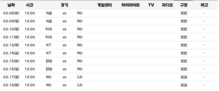 📌 NC 다이노스 시범경기 일정 (2025년 3월)
